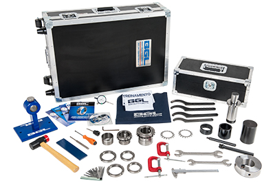 The training Kit of the BGL includes, in one case, several pieces for assembling and disassembling sleeves and bearings. This makes it possible to perform practical experiments of assembly and disassembly of adapter sleeves and withdrawal sleeves on self-aligning ball bearings and spherical roller bearings with tapered bore. KIT TR weight: 46.6 KG KIT TR dimension: H 230 X W 520 X L 810 mm
