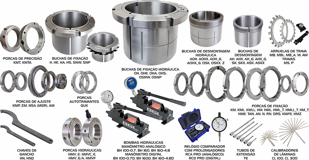 No mercado industrial de componentes para fixação de rolamentos com furo cônico, a BGL fabrica buchas de fixação e desmontagem, porcas e arruelas, assim como as ferramentas: chaves de gancho, buchas hidráulicas, porcas hidráulicas, bombas hidráulicas e tubos de extensão. Produz também peças sob medida e serviços de usinagem para terceiros. No mercado agrícola a BGL produz peças como travas, buchas bipartidas, arruelas de encosto, trava, anel distanciador e porcas de fixação. Já para carretas e trucks a sua linha de produtos são porcas casteladas, travas do cubo da roda e porcas-pinhão.